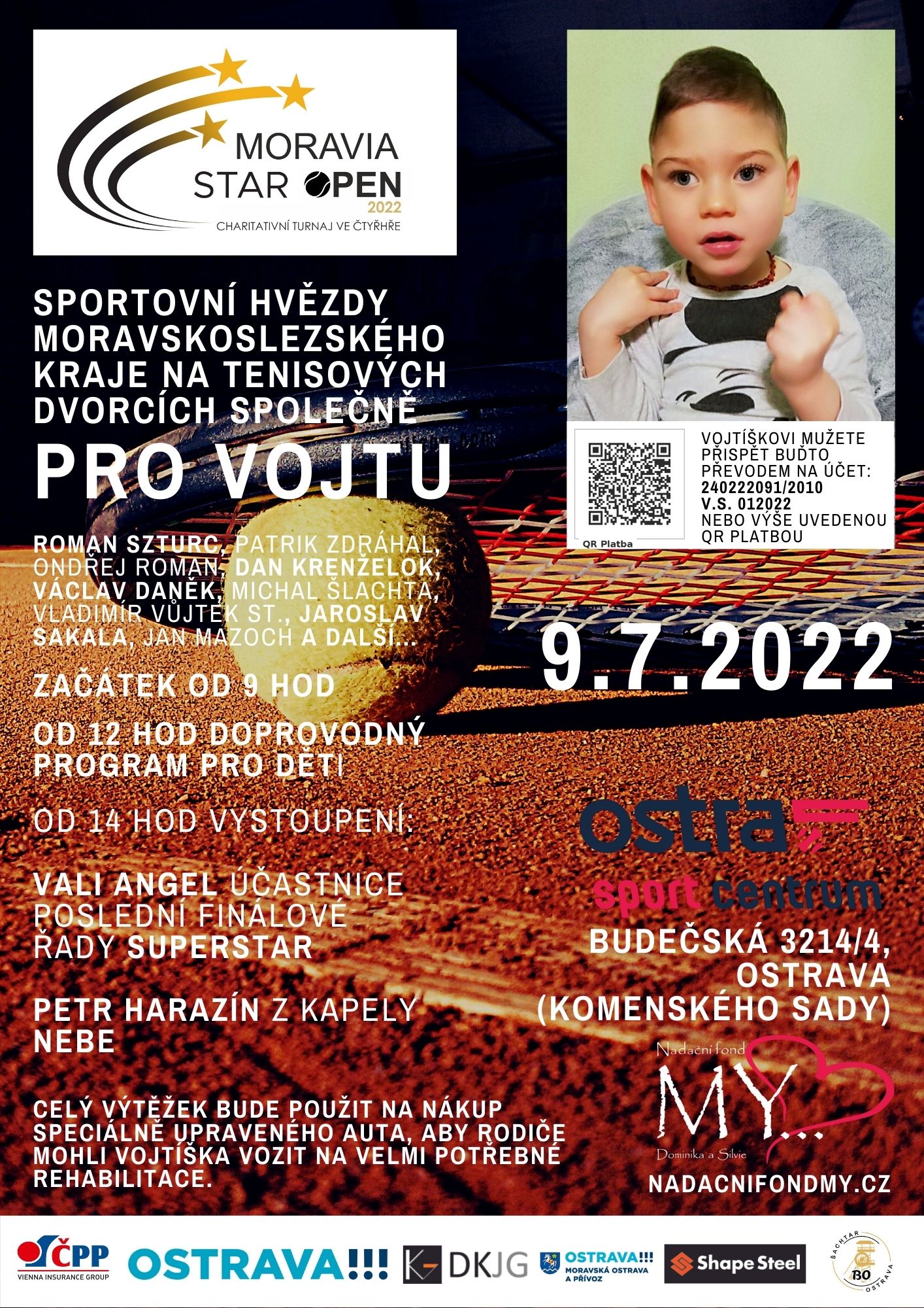 Již 9.7.2022 v areálu OSTRA sport centra v Ostravě Komenského sadech vymění sportovci kopačky, hokejky a skokanské lyže za tenisovou raketu. Těšit se můžeme na Romana Szturce, Patrika Zdráhala, Ondřeje Romana, Dana Krenželoka, Václav Daňka, Michala Šlachtu, Vladimíra Vůjtka st., Jaroslava Sakalu, Jana Mazocha a další... Petr Harazín z kapely Nebe nejen zazpívá, ale také si zahraje tenis. Přijďte podpořit sportovce a také malého Vojtu. Bohatý doprovodný program pro děti. Dále pak vystoupí i mladá talentovaná zpěvačka Vali Angel, která je účastncicí poslední finálové řady Superstár.